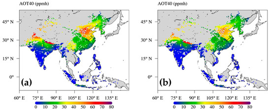 Furthermore, the area’s barometric configurations, aerodynamic orientations, velocities, and topographical attributes are conducive to the photochemical accretion of O3. In contrast, numerous sectors of central and southern India registered diminished AOT40 metrics, attributable to the incursion of pristine maritime air masses propelled by prevailing southwesterly airstreams [39]. Studies by Feng et al. [40] and Tai et al. [41] corroborated that the North China Plain exhibited relatively elevated AOT40 indices compared to central and southern China. The North China Plain is densely populated and vulnerable to anthropogenic effluents, predominantly emanating from fuel combustion. This locale is also characterized by unrelenting high-pressure systems, acute solar irradiance, low relative humidity, and moderate wind velocities, culminating in escalating O3 concentrations [41,42,43]. While direct juxtapositions are intricate owing to disparities in computational models and temporal scopes, the trends discerned in this study are congruent with antecedent scholarly investigations. One plausible explanation for the relatively subdued AOT40 levels in Asia’s equatorial latitudes could be the incursion of air masses with attenuated O3 concentrations, a consequence of the southwest summer monsoon.