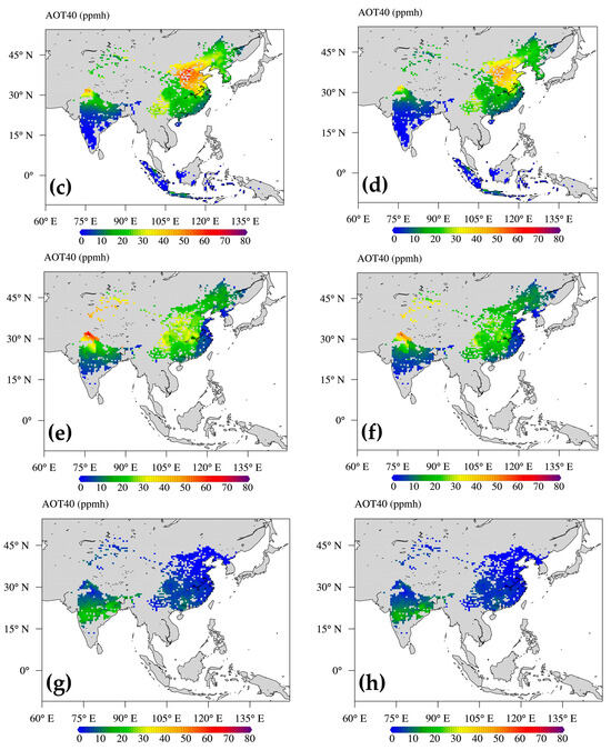 Spatial Distribution of surface-level AOT40 values for 2010 under BASE (left half) and HALF (right half) simulation. (a,b) Maize, (c,d) soybean, (e,f) spring wheat, (g,h) winter wheat.