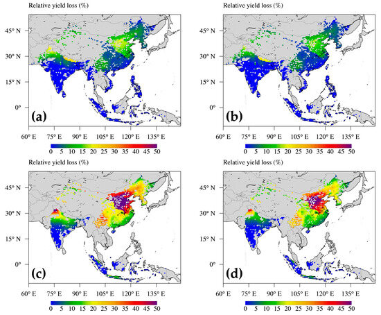 A discernible latitudinal gradient in relative yield loss (RYL) for maize, soybean, and spring wheat was manifest across East and South Asia (Figure 4). With the exception of winter wheat in the BASE scenario, the most pronounced O3-mediated RYL was localized in the industrially affluent and densely populated North China Plain, as well as the southern Himalayan region, which is subject to the influence of obstructed southern monsoon currents. Agronomic zones, barring winter wheat within the latitudinal band of 10 S–25 E, exhibited RYL values predicated on AOT40 metrics ranging from 0 to 10% for maize and soybean, and 5–15% for wheat. The decremental rates of RYL for the HALF scenario relative to the BASE were as follows: 23.1% for maize; 18.8% for soybean; 16.8% for spring wheat; and 20.9% for winter wheat (Figure 3 and Table 2 and Table 3).