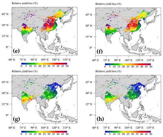 Relative yield loss (RYL) for 2010 under BASE (left) and HALF (right) scenarios. (a,b) Maize, (c,d) soybean, (e,f) spring wheat, and (g,h) winter wheat.