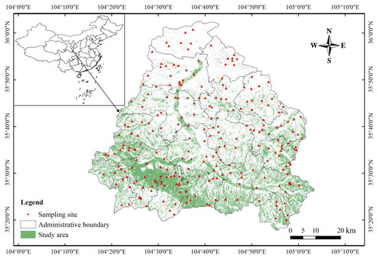 The study was conducted in a farmland area between 35°17′ and 36°02′ N and 104°12′ and 105°01′ E, with an altitude of 1700 to 2580 m. The study area was located in the Anding District in Dingxi city of Gansu Province, northwestern China, on the semiarid Loess Plateau (Figure 1), with a total area of 3.6 × 105 hm2 and an arable land area of 1.5 × 105 hm2. The semiarid western Loess Plateau has a hilly and mountainous landscape [23]. The climate of the region is typical for a temperate continental climate, with an average annual temperature of 6.3 °C and an average annual precipitation of 400 mm. The months with the highest rainfall are July, August, and September. Annual cumulative air temperature >10 °C is 2240 °C, and frost-free period is approximately 130 days, with 2480 h of sunshine per year [23,24]. In this study, the soil types included black loess soils, sierozems, and loess soils. The area is a typical dry-farming, rainfed agricultural area mainly for planting, with potatoes and corn being the main crops.