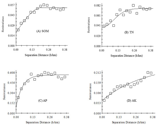 Semi-variograms of (A) SOM, (B) TN, (C) AP, and (D) AK.