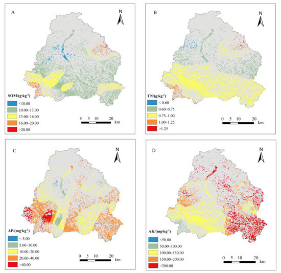 Spatial distribution maps for (A) SOM, (B) TN, (C) AP, and (D) AK.