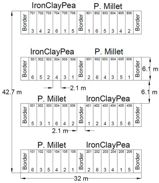 This experiment was conducted with a split-plot restriction in a randomized complete block design. The plot length was 6.1 m with a 6.1 m border in between each block to allow space for maneuvering equipment during field operations (Figure 1). The main plots included blocks of each cover crop with 6 treatments (Table 2 shows 3 termination methods × 2 equipment configurations) randomized within each of the cover crop blocks as split plots. Each cover crop block was replicated 4 times, and the cover crop factors were randomly assigned using the PROC PLAN feature in SAS [] to determine block placement. Once the blocks were assigned, the same procedure was performed to randomly assign treatments 1 through 6 within each cover crop factor.