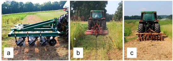 Termination occurred after sampling using the 3 different termination methods (Figure 1). Rolling/crimping was performed as a single pass using a patented four-stage roller crimper [] (Figure 2a), which has a smooth roller in the front followed by 3 consecutive straight bar crimping rollers. Mowing was performed with a single pass using a 2.1 m wide Rhino rotary mower (Figure 2b, RhinoAg, Gibson City, IL, USA). The mowing and discing (MowIncorp) treatment was performed in two separate operations with the rotary mower and then with a 1.5 m wide Bush Hog disc (Figure 2c, Bush Hog, Selma, AL, USA). Disking was performed 4–6 times per plot depending on the conditions to properly incorporate cover crop residues.