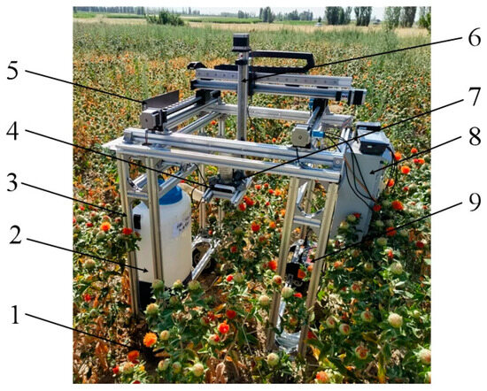 The overall structure of the safflower-picking robot. 1. Walking device; 2. collecting box; 3. machine frame; 4. visual recognition system; 5. calculator; 6. three-axis linear slide; 7. end-effector; 8. electronic control box; 9. mobile power.