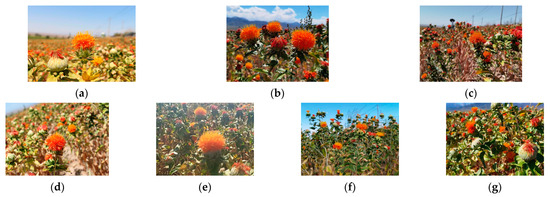 Examples of safflower images under natural environments: (a) sunny day; (b) cloudy day; (c) overcast day; (d) sunlight; (e) backlight; (f) branch and leaf occlusion; and (g) dense occlusion.