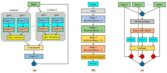 Network structure of (a) ResNeSt block; (b) ResNeSt-101; (c) split attention.