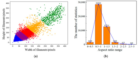 Safflower filament statistics of (a) filament size; (b) aspect ratio.
