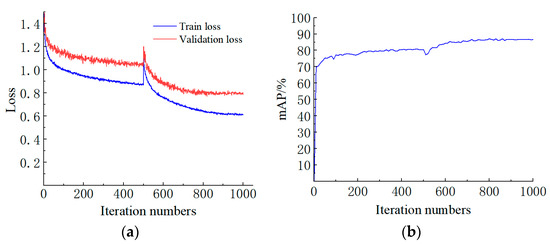The Faster R-CNN-S101 training results are shown in Figure 6. The loss value was used to check the training effect, and mAP was used to evaluate the detection accuracy mean of the model. The curve of loss value oscillated at 500 iterations due to the change in the training method. As the number of iterations increased, the loss value gradually stabilized around 0.61. The mAP was 89.14%.