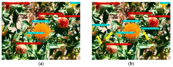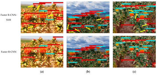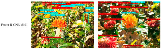 The confidence test results are displayed in Table 3. The Faster R-CNN-S101 model correctly detects the number of 9, 10, 13, 13, and 17. The Faster R-CNN model correctly detects the number of 9, 8, 11, 10, and 14. As shown in Figure 6, the missed and misdirected areas are marked with yellow arrows in the figure. The confidence level of the safflower filaments was mostly above 0.9. The Faster R-CNN-S101 model had higher confidence than the Faster R-CNN model in the corresponding detection boxes and detected a larger number of safflower filaments. The reason was that the Faster R-CNN-S101 model could extract richer feature information and had a more fitting predictive anchor box scale, which enabled the feature map to obtain better detection results. Therefore, the Faster R-CNN-S101 model enhances the confidence level of the detected safflower filaments with better detection ability.