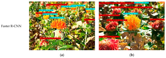 Five groups of images containing different numbers of safflower filaments were selected to test the Faster R-CNN and Faster R-CNN-S101 models. The comparison of confidence quantities is shown in Table 3. The typical detection results of group 2 in Table 3 are shown in Figure 7.