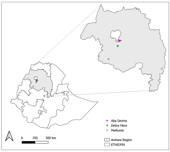 This study was conducted in Ethiopia’s western Amhara region. Trials were implemented in three districts, Bahir Dar Zuria, Yilmana Densa, and Womberma, with one site in each district, Aba Gerima, Debre Mewi and Markuma, respectively (Figure 1). The western Amhara region has a unimodal rainfall system comprising a main growing season (Kiremt) which spans from June to September [24]. Mixed crop-livestock systems are typically practiced, with sparsely distributed tree cover. Crop production in this region is diverse, with a wide range of cereals namely teff, wheat and maize (Zea mays L.), while Triticale (Triticosecale Wittm. ex A. Camus) and rice (Oryza sativa L.) are produced at a much smaller scale. Pulses, including chickpea (Cicer arietinum L.), faba bean (Vicia faba L.), common bean (Phaseolus vulgaris) and lentil (Lens culinaris Medik.) are also major components of the cropping system. Western Amhara has a subtropical climate, receiving average annual rainfall of 1022–1450 mm and is situated 1800–2200 m above sea level (masl). The total amount of rainfall received during the 2018 and 2019 cropping seasons was 1431.8 and 1591.8 mm, respectively (Figure 2). The most dominant soils are Nitisols, Andosols, Cambisols, Vertisols and Luvisols. High soil degradation, aggravated by soil acidity and nutrient mining, is apparent in this region.