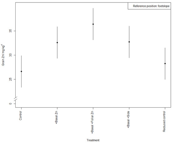 Grain Zn concentration in wheat ranged from 26.6 to 36.4 mg kg−1 (Figure 3) with largest concentrations attained with co-application of basal and foliar Zn fertilizer. Strong evidence of fertilizer application effects on grain Zn concentration in wheat was evident in both C1 (no Zn input vs. Zn) and C2 (soil vs. soil + foliar application); (p < 0.001) (ANOVA Table S1 Supplementary File). There was no evidence for any interaction of the treatment contrasts with landscape unit (p > 0.05; ANOVA Table S1 Supplementary File). For this reason, mean Zn concentrations can be plotted for each treatment with foot slope as the reference position in Figure 3 (i.e., the expected concentration under each treatment at a foot slope position), and the additive effects of landscape position with the control fertilizer treatment as reference are shown in Figure 4 (i.e., the expected concentration at each landscape position if the control fertilizer treatment is applied).