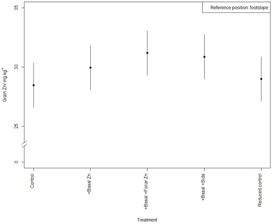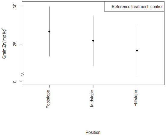 Moderate evidence for an effect of landscape unit on grain Zn concentration in wheat was observed (p = 0.029; ANOVA Table S1 Supplementary File). Wheat grown on foot slope positions had a larger grain Zn concentration of 26.6 ± 3.3 mg kg−1 compared to 25.5 and 24.1 ± 3.3 mg kg−1 attained on mid-slope and hillslope, respectively, when the control was used as the reference fertilizer treatment (Figure 4).