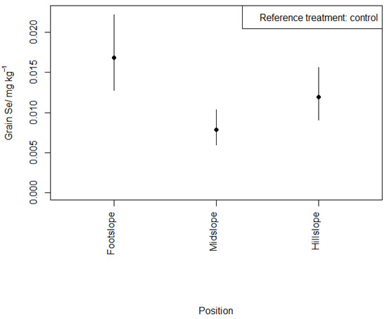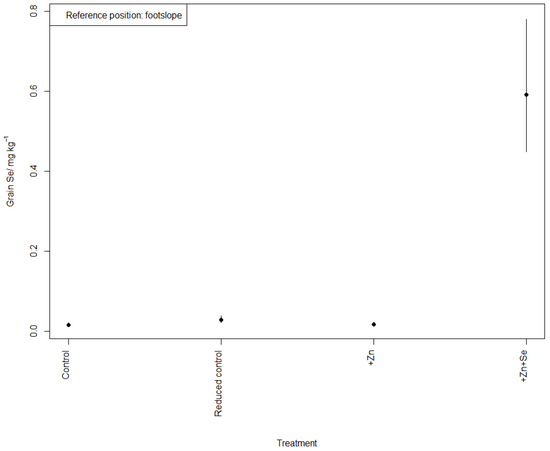 There was strong evidence to reject the null hypothesis of no difference among landscape positions (p < 0.001), but no evidence for any interaction of fertilizer treatment effects with landscape position. The fertilizer treatment means, with foot slope as reference position, are therefore shown in Figure 6. There was strong evidence to reject the null hypothesis for C1 (Se application effect; p < 0.001) and C3 (control vs. ⅓ control; p < 0.001; ANOVA Table S3 Supplementary File). Application of Se significantly increased grain Se concentration in wheat to 0.59 mg kg−1 compared to non-Se treatments (0.02–0.03 mg kg−1; C1). Without Se fertilization, the ⅓ control macronutrient fertilizer application rate significantly increased grain Se concentration by 50% from 0.02 (full control) to 0.03 mg kg−1 (0.33 control; C3). No evidence of Zn fertilizer effect on wheat grain Se concentration was reported when Se was not applied. Treatment means in Figure 6 are back transformed to the original units, so the mean values are median unbiased. The largest grain Se concentrations were found on foot slope positions, followed by hillslopes and lastly mid-slopes (Figure 7).