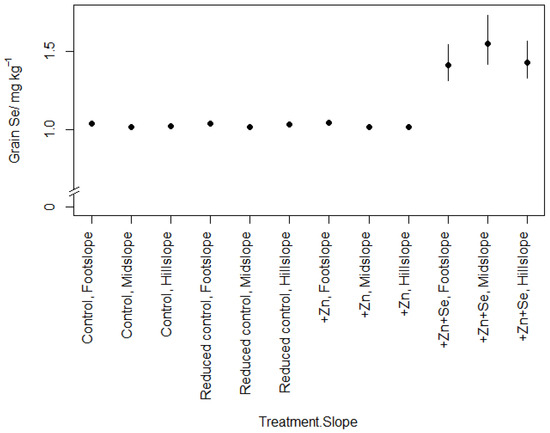 Teff grain Se concentration ranged from 1.01 to 1.55 mg kg−1 in different treatments and on different landscape positions (Figure 8). The application of Se fertilizer significantly resulted in the largest grain Se concentration compared to treatments which did not receive Se fertilizer (C1; p < 0.001) indicating strong evidence to reject the null hypothesis for C1. No evidence of Zn fertilizer effect (C2) or an effect of ⅓ control rate application of macronutrient fertilizers (C3) on grain Se concentration in teff was observed (p > 0.05; ANOVA Table S4 Supplementary File). Strong evidence for a landscape unit effect on grain Se concentration in teff was reported (p < 0.001). Similarly, strong evidence for an interaction effect of C1 (Se fertilizer application) with landscape unit on grain Se concentration in teff was observed (p < 0.001). Because of the interaction term, Figure 8 shows the means and SE for all factorial combinations, back transformed to the original units, so the mean values are median unbiased. In the absence of applied Se, the concentrations are slightly larger on foot slopes than other slope positions. However, the response to applied Se is rather larger on mid-slopes than other landscape positions. In contrast, teff grain Se concentrations at foot slope position were similar to hillslope (Figure 8).