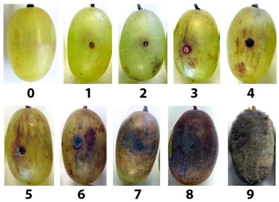 Visual scale for estimation of a grape berry infection with B. cinerea (0–9-scale, where 0 corresponds to a healthy berry).