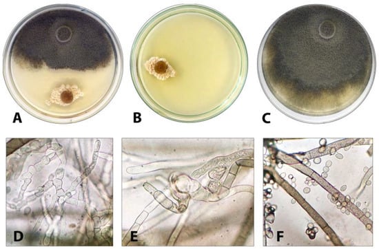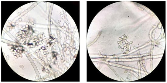 Colonies grown on PDA were characterized by rapid growth, were dark-grey and felty, and formed regular circles whose diameter reached 4–4.5 cm on the fourth day of cultivation. No sclerotia were observed. The hyphae were thin and septated. Conidiophores were well distinguished from vegetative hyphae; they were tree-shaped with short branches carrying smoke-colored conidia (9.0–17.50 × 6.50–10.0 µm in size) collected into dense clusters or heads. Conidia were oval-shaped with a thin beak near the base (Figure 2). The optimal temperature for colony growth was 22–24 °C, with complete growth inhibition at 28 °C.