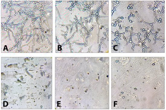 During germination, conidia form germ tubs, whose elongation is followed by further hypha branching. The results of the experiment are shown in Figure 5. Almost complete inhibition of conidial germination was observed for DMP concentrations of 5.0 and 10.0 g/L (Figure 5E,F). In the case of a DMP concentration of 2.5 g/L, germ tubes started to form at the end of the first 24 h of incubation (Figure 5D). DMP concentrations of 0.625 and 1.25 g/L (Figure 5B,C) were insufficient for inhibition of conidial germination of the pathogen; the length of fungal hyphae observed in these variants was comparable with that of the control variant (Figure 5A).