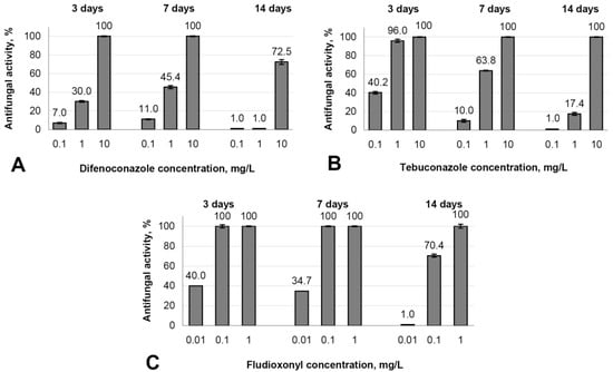 According to the obtained data, on the seventh day of incubation, the maximum (100%) growth inhibition of B. cinerea was observed for difenoconazole taken at a concentration of 10.0 mg/L (Figure 6A). On the fourteenth day of incubation, the pathogen spread almost over the whole Petri plate surface, and the antifungal activity of the fungicide was reduced to 72.5%. The fungicide concentration corresponding to 50% antifungal activity (effective concentration) was calculated by probit analysis and was equal to 1.0 mg/L. In the case of a minimal fungicide load (0.1 mg/L), the antifungal effect was almost absent.