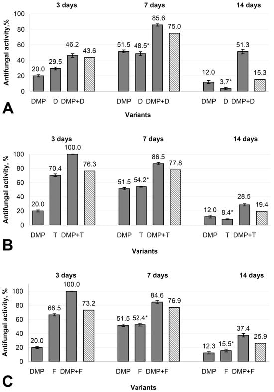 Antifungal activity of a dry mycelium biomass of Penicillium chrysogenum VKM F-4876D (DMP, 2.5 g/L) combined with (A) difenoconazole (D, 1.0 mg/L), (B) tebuconazole (T, 0.5 mg/L), and (C) fludioxonyl (F, 0.04 mg/L) against Botrytis cinerea. The hatched bar shows the expected antifungal activity (Ee) calculated by Limpel’s formula. Values that were not significantly different from the values obtained for the DMP only are indicated by the asterisk.
