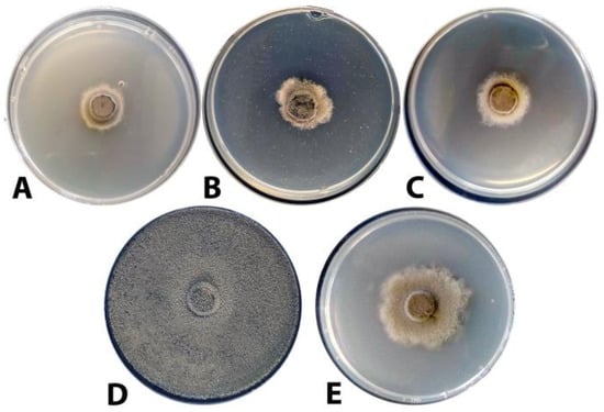Colony growth of B. cinerea on the PDA medium supplemented with DMP (2.5 g/L) combined with the tested fungicides: (A) DMP + fludioxonil, 0.04 mg/L; (B) DMP + tebuconazole, 0.5 mg/L; (C) DMP + difenoconazole, 1.0 mg/L; (D) control; (E) DMP.