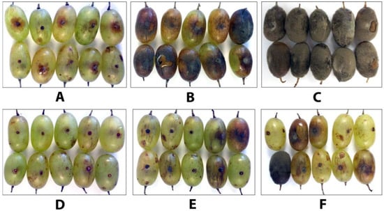 Level of affection of DMP-treated grape berries (cv. Husain) with Botrytis cinerea evaluated on the third (A,D), seventh (B,E), and twelfth (C,F) days of the experiment using a 0–10-score scale. (A–C), control; (D–F), DMP-treated berries.