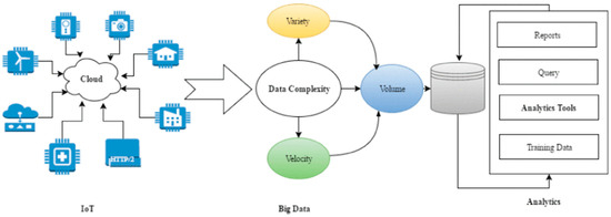 Big data analysis is a methodical strategy that applies cutting-edge analytic tools to big data sets. This entails the integration of two technical components, namely extensive data sets and an array of analytics tool categories such as data mining, statistics, AI, predictive analytics, and natural language processing (NLP), among others. The analysis of such data is accomplished through the utilization of big data mining techniques. In the realm of smart agriculture, the feasibility study is significantly improved by the application of IoT and big data analytics in the cloud [2,18]. In Figure 1, we can see the relationship between IoT and data analytics. Because of the volume, velocity, and variety of data generated by IoTs, they are classified as “big data systems”. These data are mined and processed in order to show the relationships between inputs and outputs [31].