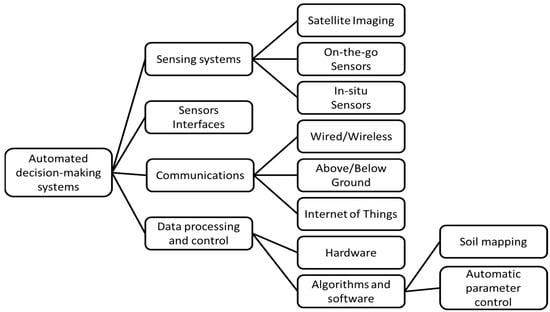 The implementation of fully automated decision making systems (ADMS) is essential in precision agriculture. These systems are designed to monitor multiple chemical or physical parameters of soil and plants while simultaneously regulating them to maintain optimal conditions for each specific plant or soil type. Despite the feasibility of developing such systems using existing technologies, the implementation of ADMS encounters significant challenges. ADMS generally consists of four main sections: the sensing technique, sensor interfaces, the information transmission platform, and the data processing and control unit; the crucial role of precision agriculture in utilizing both historical and real-time data for well-informed decision making is highlighted by both studies. Despite its feasibility, both studies agree that deploying ADMS is challenging. They develop a comprehensive view of the changing precision agricultural scene, combining data-driven insights with the complexities of implementing automated systems technologies. Figure 2 shows the general structure of automated decision-making systems [48].