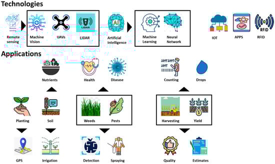 Sensors are utilized at various stages of the farming process, from planting through the packaging of the final product. The farming process can be broadly classified into distinct categories, including planting, soil management, nutrient and water management, pest and disease management, yield harvesting, and post-harvest processing, all of which can benefit from the integration of advanced sensing technologies. Figure 3 shows sensing technologies and their applications in agriculture [61,62].