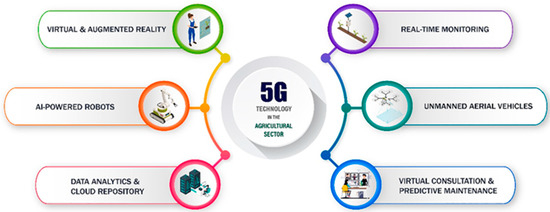 5G technology allows the increasing usage of IoT applications in digital agriculture and the advancement of precision farming technologies, allowing spot spraying and real-time image collecting without latency. As a result, overall agricultural efficiency, resource optimization, and sustainability improve. The use of 5G in agriculture represents a paradigm change, providing farmers with advanced technologies to handle the problems of modern farming while also contributing to global food security [100,114].