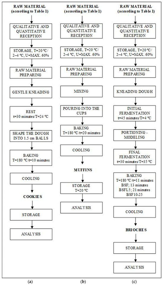 The technological process and technical operating parameters of pastry products are carried out according to steps from chart-flow presented in Figure 1: (a) of cookies, (b) of muffins, and (c) of brioches. The doughs were prepared using a Maxima Spiral Mixer, MSM 10, and then were cooked in an FM pastry oven, which is electric and has 10 trays and touch screen control panel in compliance with the technological parameters shown in Figure 1 for each pastry product category.
