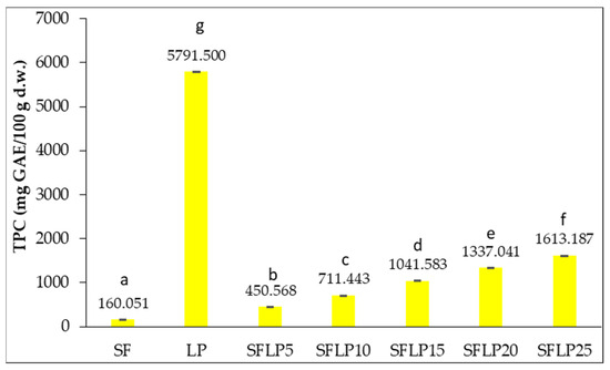 Total polyphenolic content (TPC) of SF, LP, and fortified flours. Results are expressed as the mean value of three determinations ± standard deviation (SD) indicated by the error bars. According to the t-test, different letters (a–g) represented in the columns are significant differences (p < 0.05) between the values of the samples.