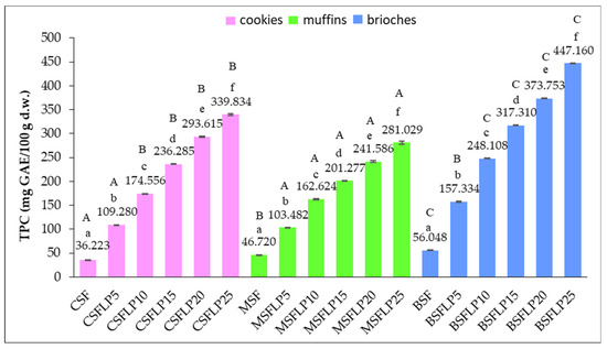Total polyphenolic content (TPC) of the pastry products. Results are expressed as the mean value of three determinations ± standard deviation (SD) indicated by the error bars. According to the t-test, different letters (a–f) represent significant differences (p < 0.05) between the values of samples from the same category. Different capital letters (A–C) represent significant differences between the values of samples containing premix with the same proportion of CSF and LP.