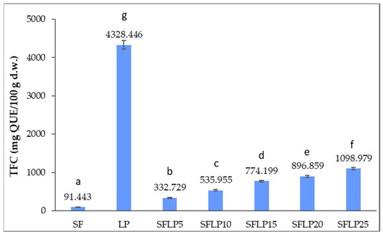 Total flavonoid content (TFC) of SF, LP, and fortified flours. Results are expressed as the mean value of three determinations ± standard deviation (SD) indicated by the error bars. According to the t-test, different letters (a–g) represented in the columns are significant differences (p < 0.05) between the values of the samples.