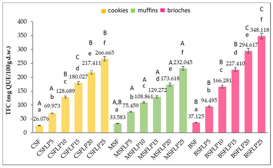 Total flavonoid content (TFC) of the pastry products. Results are expressed as the mean value of three determinations ± standard deviation (SD) indicated by the error bars. According to the t-test, different letters (a–f) represent significant differences (p < 0.05) between the values of samples from the same category. Different capital letters (A–C) represent significant differences between the values of samples containing premix with the same proportion of CSF and LP.
