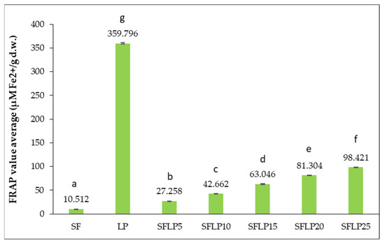 Ferric reducing antioxidant power (FRAP) of SF, LP, and fortified flours. Results are expressed as the mean value of three determinations ± standard deviation (SD) indicated by the error bars. According to the t-test, different letters (a–g) represented in the columns are significant differences (p < 0.05) between the values of the samples.