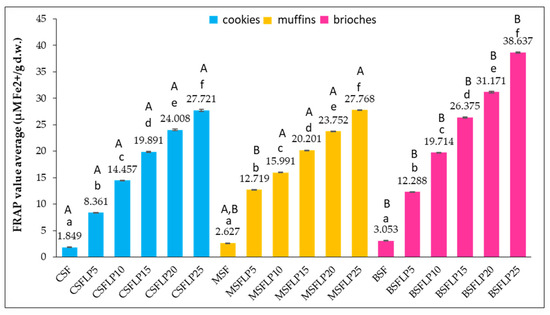 Ferric-reducing antioxidant power (FRAP) of pastry products. Results are expressed as the mean value of three determinations ± standard deviation (SD) indicated by the error bars. According to the t-test, different letters (a–f) represent significant differences (p < 0.05) between the values of samples from the same category. Different capital letters (A,B) represent significant differences between the values of samples containing premix with the same proportion of CSF and LP.