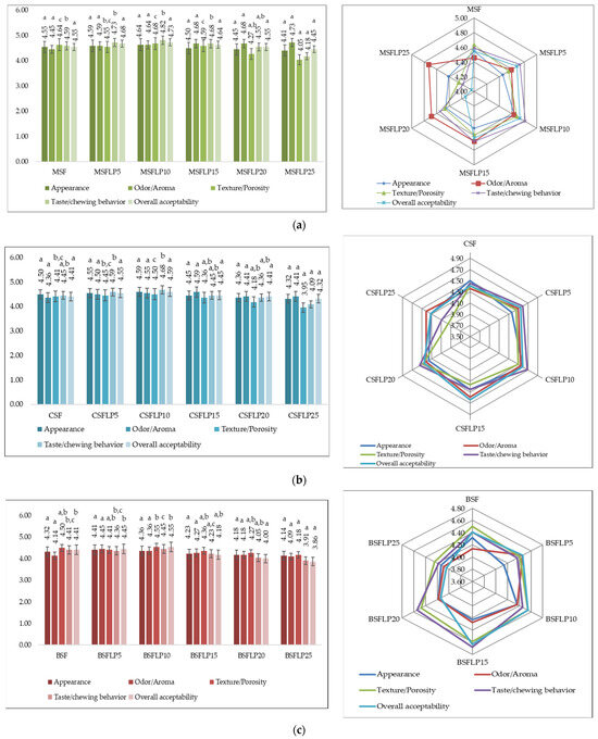 Figure 8a–c indicates the mean scores for the sensory attributes (appearance, texture/porosity, taste/chewing behavior, odor/aroma, and overall acceptability) of the studied pastry products and emphasizes the influence of the addition of different proportions of lingonberries in obtaining spelt pastry products on their sensory characteristics. The highest scores were recorded in muffin samples, especially MSFLP10 samples (10% lingonberries powder) concerning the attributes: appearance (4.636), taste/chewing behavior (4.818), texture/porosity (4.682) and overall acceptability (4.727), while the lowest values were those of MSFLP25 (25% lingonberries powder) recording 4.409 points in appearance, 4.245 points in texture/porosity, 4.182 in taste/chewing behavior, and 4.045 points for overall acceptability (Figure 8a). Among studied pastries, brioches with fortified flours were less appreciated by consumers registering, in terms of overall acceptability, values between 3.8636 (BSFLP25) and 4.5455 (BSFLP10) (Figure 8c). After muffins, cookies were preferred by consumers registering values between 4.4091 (CSF) and 4.5909 (CSFLP10) to overall acceptability. In terms of the most appreciated proportion of lingonberries added, the 10% of LP added in the formula was the most appreciated in terms of taste, aroma, and overall acceptability of all products.
