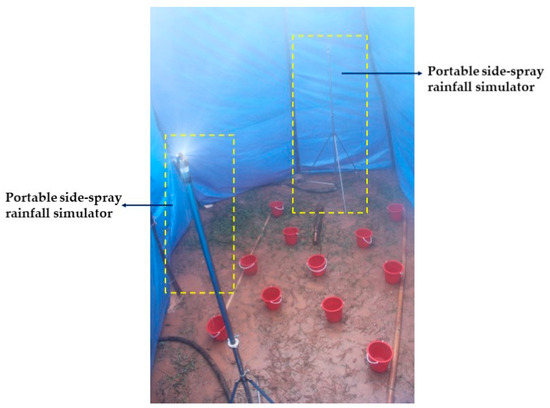 A randomized block design was employed for this experiment. To replicate the high precipitation levels in the Ya’an region, which has an average annual precipitation of around 1800 mm, and to enhance comparability with previous studies, three rainfall intensities (60, 90 and 120 mm·h−1) were selected. Each intensity had a 60-min duration. Light rainfall (60 mm·h−1), moderate rainfall (90 mm·h−1), and heavy rainfall (120 mm·h−1) were the classifications.