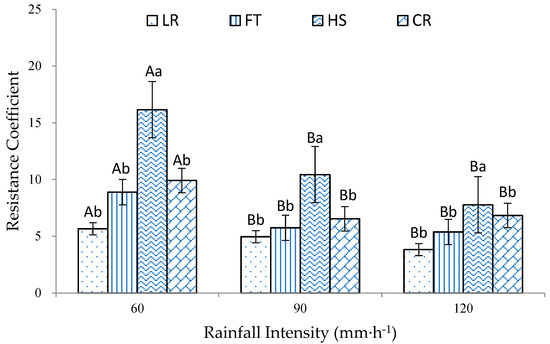 Resistance coefficient under different experiment conditions. LR represents longitudinal ridge tillage; FT represents flat tillage; HS represents hole sowing; CR represents cross ridge tillage. Error bars are represented as standard errors. Different uppercase letters indicate significant differences in the same tillage practice under different rainfall intensities, while different lowercase letters indicate significant differences between different tillage practices under the same rainfall intensity (p < 0.05, Duncan). Same as below.