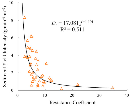 Figure 6 displayed the relationship curve between slope sediment yield intensity and resistance coefficient. It revealed a power function relationship between the two variables, indicating that as the resistance coefficient increased, the sediment yield intensity decreased. This was because a higher resistance coefficient impeded and infiltrated more runoff, lading to reduced runoff and sediment yield. The negative power function nature of the curve resulted in an increasing derivative at the corresponding point of the resistance coefficient. When the ratio between the increment of sediment yield intensity (ΔDr) and the increment of resistance coefficient (Δf) reached −1, the resistance coefficient was approximately 3.96. This suggested that if the resistance coefficient was below this value, increasing it would lead to a sharp decline in sediment yield intensity. However, once this threshold was surpassed, the impact of the increasing the resistance coefficient on sediment yield intensity gradually diminished.