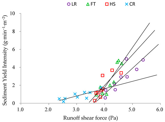 Runoff shear stress acts as the main force responsible for soil particle detachment and sediment transport. As the runoff shear stress surpassed the soil’s critical shear stress, the excess effective shear stress disrupted the soil structure, resulting in the erosion of soil particles by runoff and their subsequent transportation to the slope surface. By analyzing the relationship between sediment yield intensity on the slope and runoff shear stress under different tillage practices, as depicted in Figure 7, it is evident that the sediment yield intensity increased linearly with the rise in runoff shear stress for each practice.