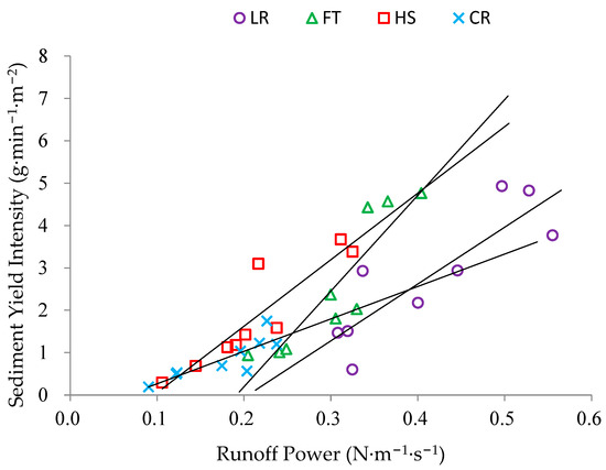 The relationship between runoff power and sediment yield intensity under different tillage measures. LR represents longitudinal ridge tillage; FT represents flat tillage; HS represents hole sowing; CR represents cross ridge tillage.