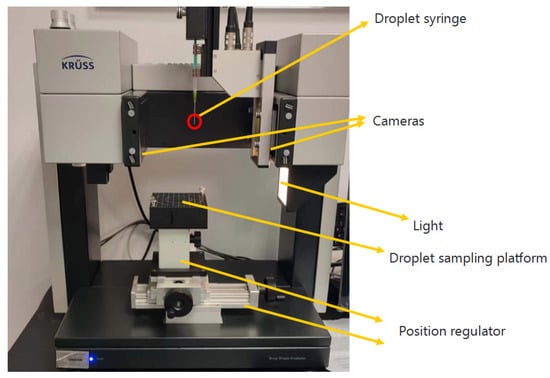 The optical contact-angle-measuring instrument, DSA100S (A. Kruess Optronic GmbH, Stuttgart, Germany), was utilized to determine the CAs and STs of the PEW solutions. The main parameters of the instrument are presented in Table 2, and a visual representation of the instrument can be seen in Figure 2. The measurements were taken using deionized water and adjuvants. During the experiment, a volume of 1 μL of solution was dispensed for the ST measurement with the hanging drop method, and 1 μL of solution was applied to a polyester card on the droplet sampling platform for the CA measurement with the sessile drop method via a Hamilton line syringe. The instrument’s video system uses cameras, facilitated by software ADVANCE 1.6. Each measurement was repeated three times, and the average value was taken as the test outcome. Test results were exported in EX-CEL format for further analysis.