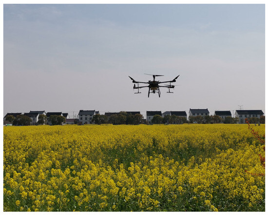 The experimental site was situated within the Wujiang National Agricultural Modern Demonstration Zone (31.18022° N, 120.76267° E) in Suzhou City, Jiangsu Province, China. The trials were conducted on 8 April 2021, with a mean wind speed of 0.45 m/s and a mean temperature of 14.68 °C. The aerial spraying tests were conducted using the V25, a four-rotor electric crop protection UAV V25 (Wuxi Hanhe Aviation Technology Co., Ltd., Wuxi, China). The UAV is depicted in Figure 3. It is a fully autonomous crop protection UAV with a real-time kinematic Global Positioning System (RTK-GPS) and customization of flight routes, flight height, flight speed and aerial spraying rate. The primary technical specifications of V25 are shown in Table 3.