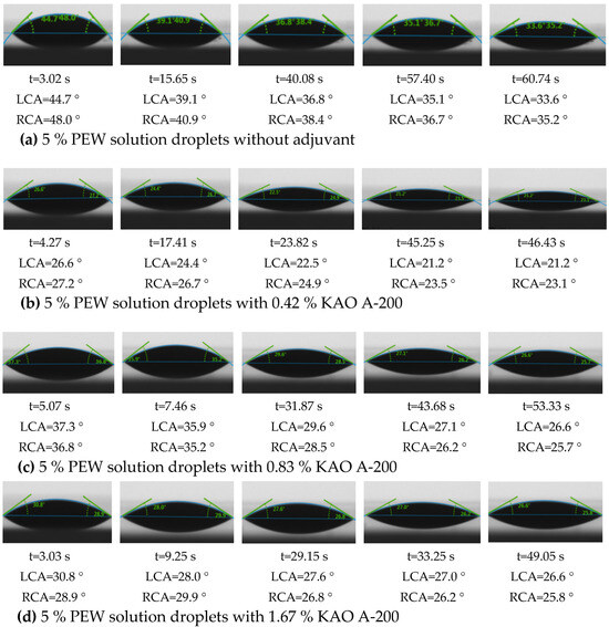 The 0.42%, 0.83% and 1.67% concentrations of KAO A-200 were added to the 5% concentration PEW solution at the recommended dosage (60 mL, 27 g a.i. per 1.2 L solution), respectively. Figure 6 shows the wetting changes in the 5% concentration PEW solution droplets with different concentrations of KAO A-200. As depicted in Figure 6, the droplets of the 5% PEW solution underwent a transition from their initial state to a state of steady spreading within approximately 60 s regardless of whether the KAO A-200 was added or not. However, upon comparing Figure 6a with Figure 6b–d, it becomes evident that the spreading speeds of the PEW solution droplets with adjuvants were faster, while the contact angles (CAs) were significantly reduced. Therefore, it is believed that the adjuvant KAO A-200 changed the droplet properties of the PEW solution. Furthermore, it was found that the 5% PEW solution droplets’ spreading time and CAs differed with adjuvant concentration, indicating that the concentrations of KAO A-200 had effects on the PEW solution. The analysis was conducted in conjunction with the results of specific ST and CA tests, as follows.