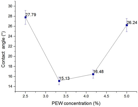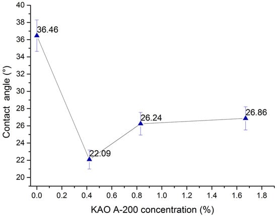 The CAs did not change monotonously with different concentrations of PEW solution and KAO A-200 OC shown in Figure 10. The maximum CA value was 27.79°, as observed for the PEW concentration of 2.5%, but the results show that when the PEW concentrations were 3.33% and 4.17%, the CAs decreased significantly to 15.13° and 16.48°, respectively. When the concentration of PEW was increased to the recommended level of 5%, the CA value also increased to 26.24°, which was found to be comparable to the CA value observed at a concentration of 2.5%.