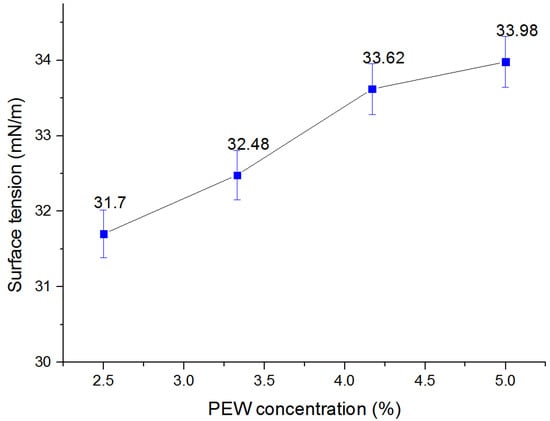 Based on the OC of KAO A-200, as determined in Section 3.1, the optimal STs and CAs for 2.5%, 3.33%, 4.17% and 5% concentration PEW solutions were investigated at the KAO A-200 additive concentration of 0.83. The ST values increased but changed slowly as the PEW concentration increased under the KAO A-200 OC condition shown in Figure 9; even at the recommended 5% concentration for the PEW solution droplets, the ST was 33.98 mN/m. Some of the critical surface tensions of common crop leaves are shown in Table 4. It can be seen that the STs of rice, wheat, cotton, pepper, etc., range from 36 mN/m to 72 mN/m. From the perspective of ST value, the STs of 2.5%, 3.33%, 4.17% and 5% KAO A-200 concentration PEW solutions were all smaller than those of the common crop leaves shown, and PEW solutions can easily adhere to the leaves of these crops in actual practice.